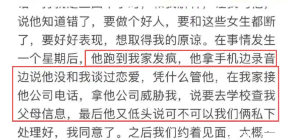 李禹熹熹还曾经发现荣梓杉至少同时交往了3名女生,她遭受了长期的冷暴力和不公对待,后来还遭到殴打。